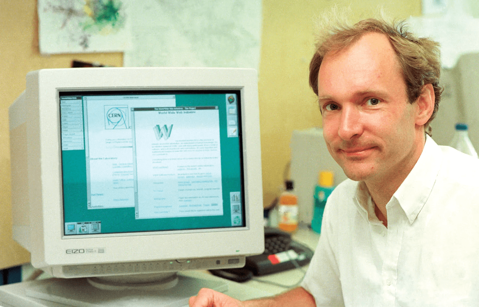 В 1981 году Тимоти Бернерс-Ли начал руководить технической частью компании Image Computer Systems Ltd. Тогда его внимание было сосредоточено на работе над проектом вызова удаленных процедур в реальном времени. В конце концов, специалист вернулся в ЦЕРН в качестве научного сотрудника в 1984 году. Работа в крупнейшем узле Интернета Европы вдохновила его на объединение гипертекста с цифровой сетью. Сначала проект Всемирной паутины был направлен на оптимизацию человеческого сотрудничества. Первый сервер и клиент стали доступными для ЦЕРНа в 1990 году, а для широкой общественности — в 1991 году. В списке 80 важнейших культурных моментов изобретение Всемирной паутины заняло первое место за революционный вклад в коммуникацию людей.