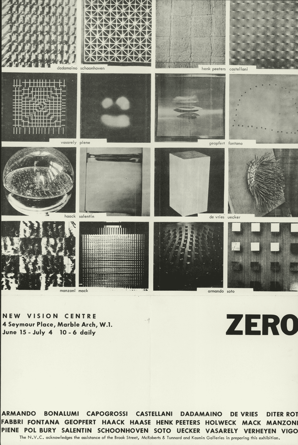 Так, галерея New Vision Center організувала експозицію італійських концептуалістів Енріко Кастеллані та П’єро Мандзоні у 1960 році. У результаті вони привернули увагу розкриттям матеріальних та просторових аспектів особливого художнього процесу у період свого становлення серед широкого загалу. У 1964 році виставковий простір долучився до висвітлення діяльності німецької мистецької групи «Zero» Гайнца Мака та Отто Піне. Вона пропагувала чистоту форми, використання нетрадиційних матеріалів та світлові ефекти. Загалом команда прагнула до «нульової точки» — нового творчого початку після травм Другої світової війни.